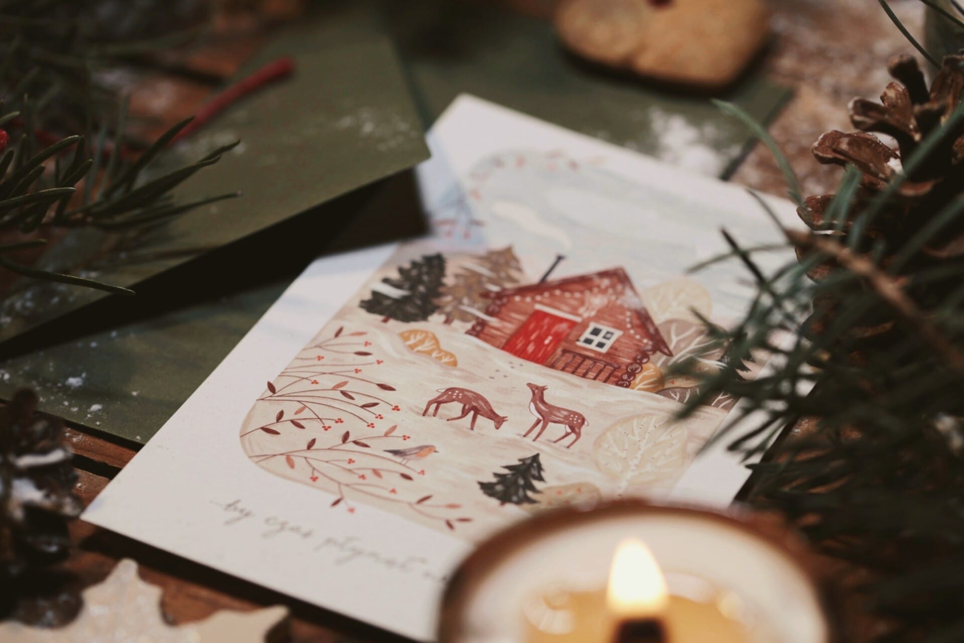 Baśniowy krajobraz pełen magii – takie było nasze pragnienie, gdy zlecaliśmy stworzenie grafiki zimowej, mającej otulić całą Kolekcję Zimową. Każdy detal tej kartki został starannie zaprojektowany, by uchwycić zimowy klimat i spokój. Na szczycie uroczego domku znajduje się mandala – symbol harmonii i równowagi, a także element naszego logotypu.