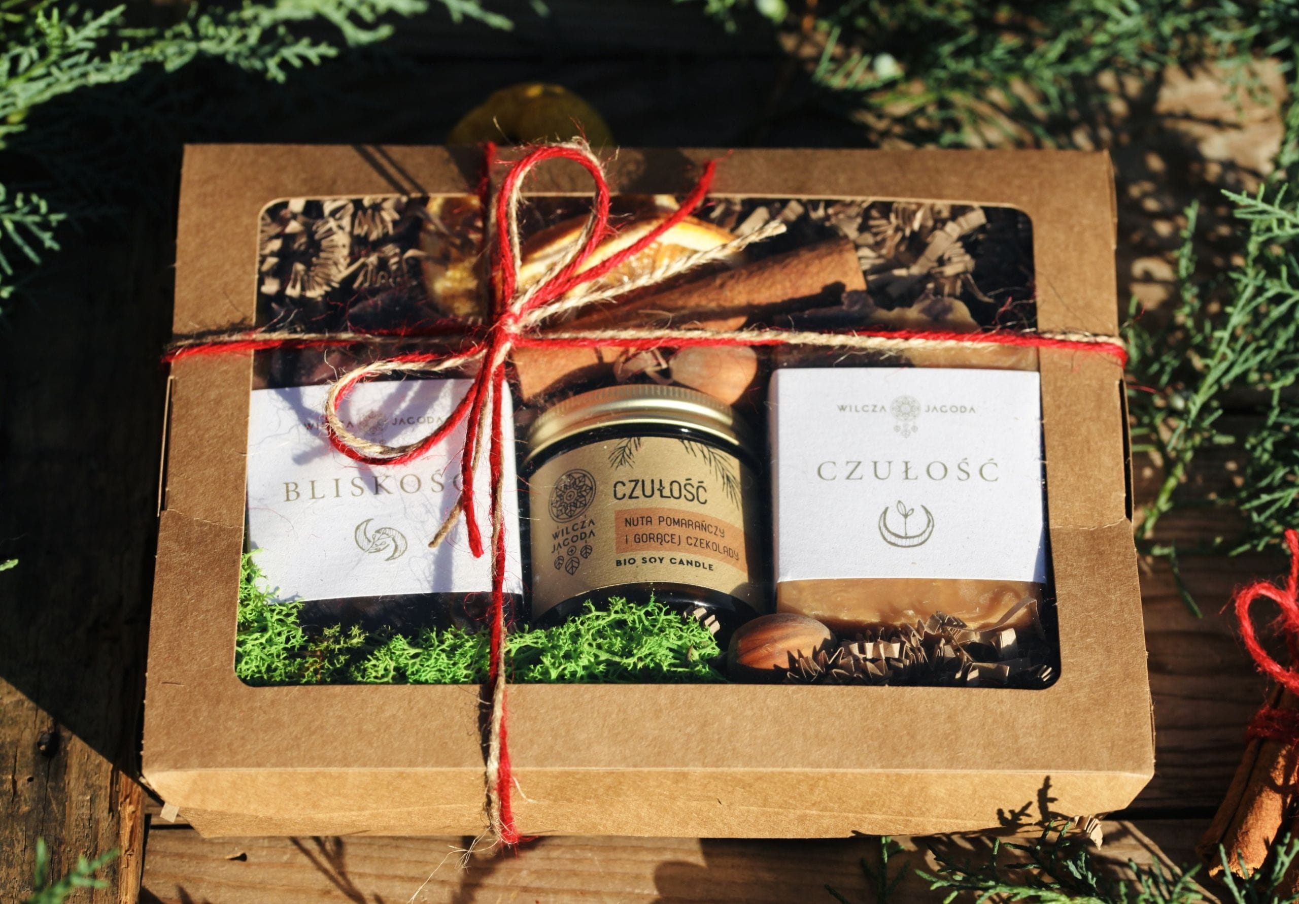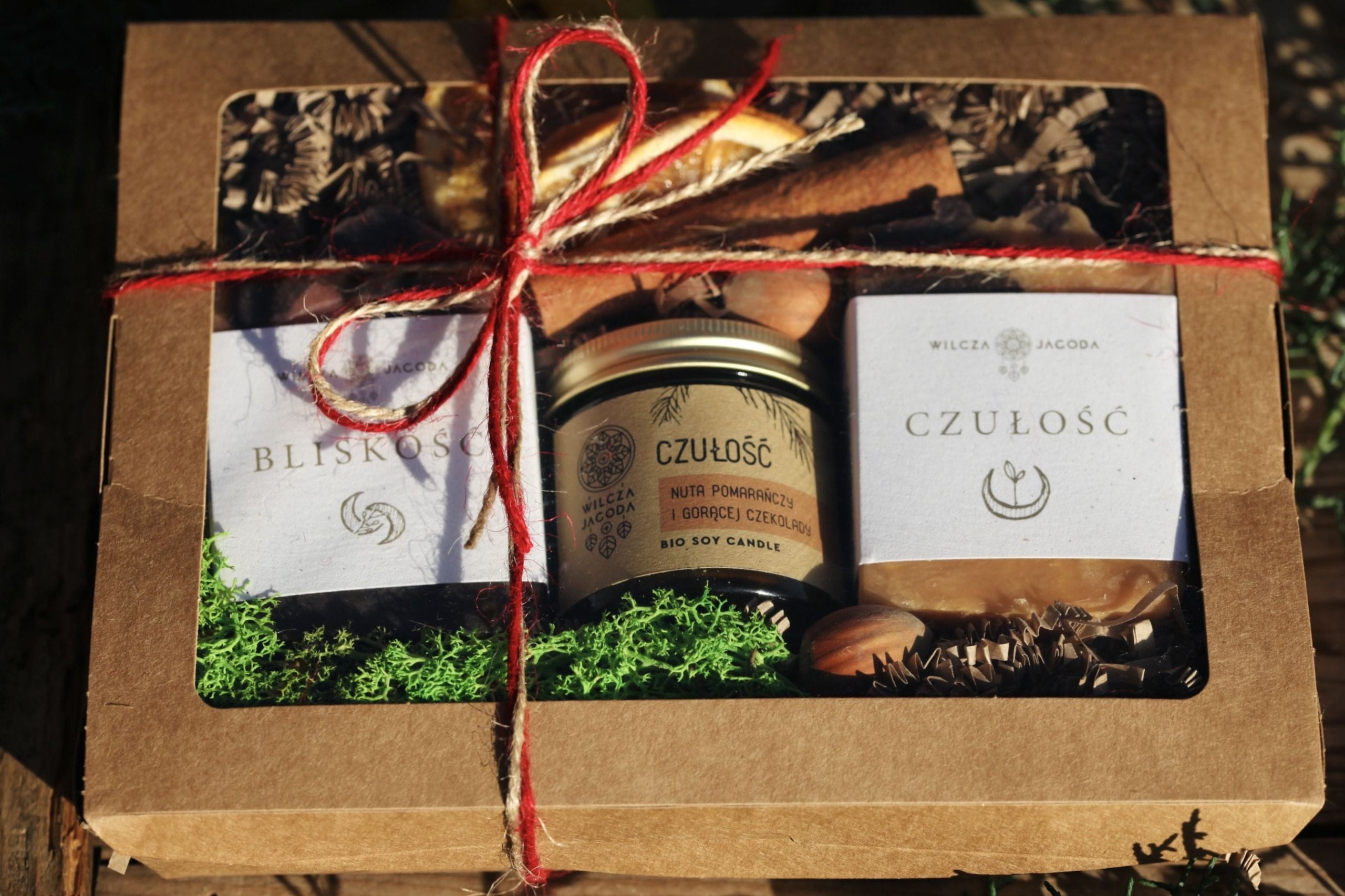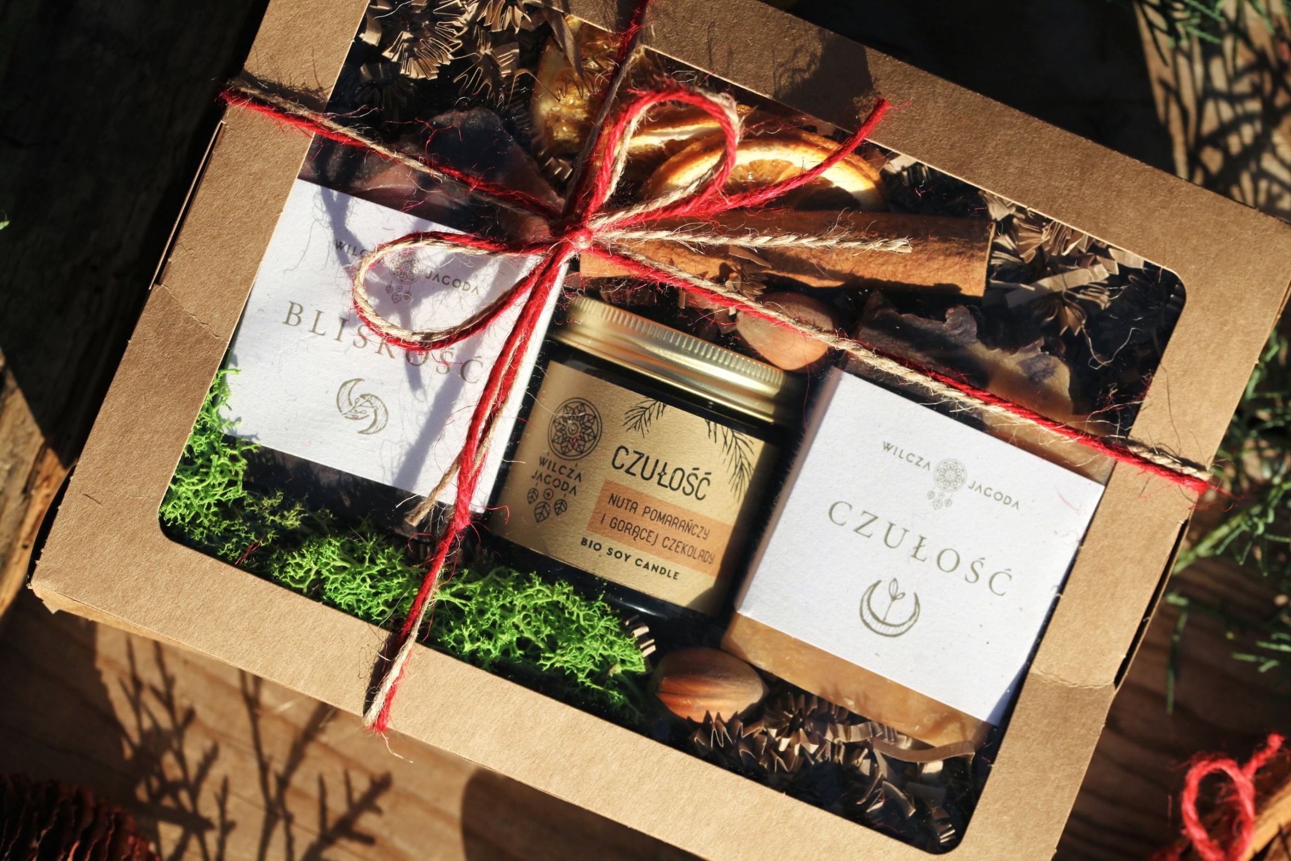 Wszystkie produkty ułożone są w biodegradowalnym kartoniku z kukurydzy, który wypełniamy wiórkami papierowymi. Wokół mydeł i świecy umieszczamy suszone ozdoby, owoce, cynamon, szyszki itp. Kartonik przewiązany jest naturalnym sznurkiem, a na jego szczycie, pod kokardką znajduje się złoty dzwoneczek.