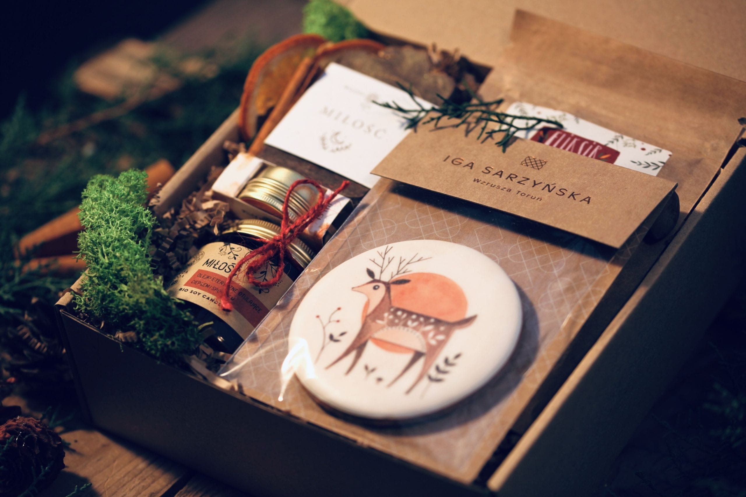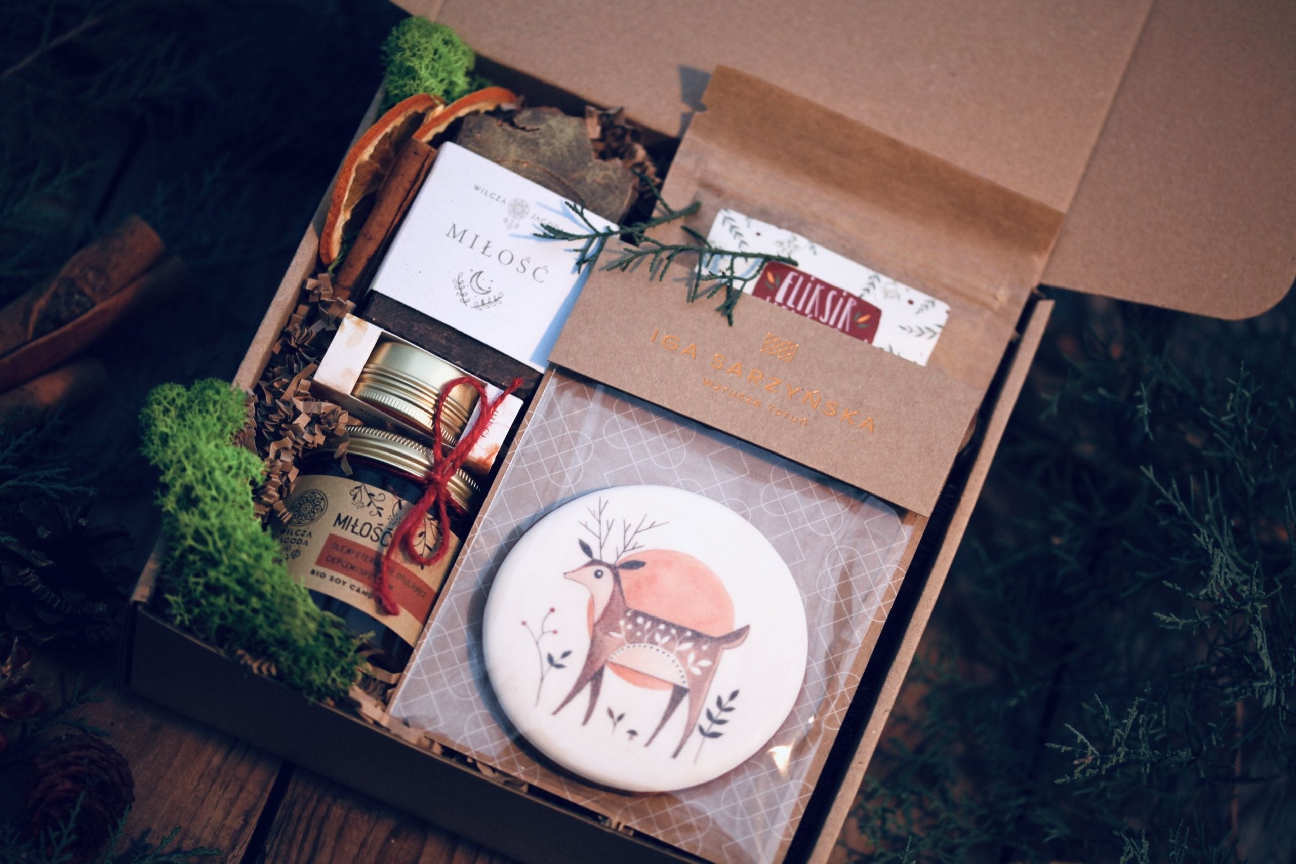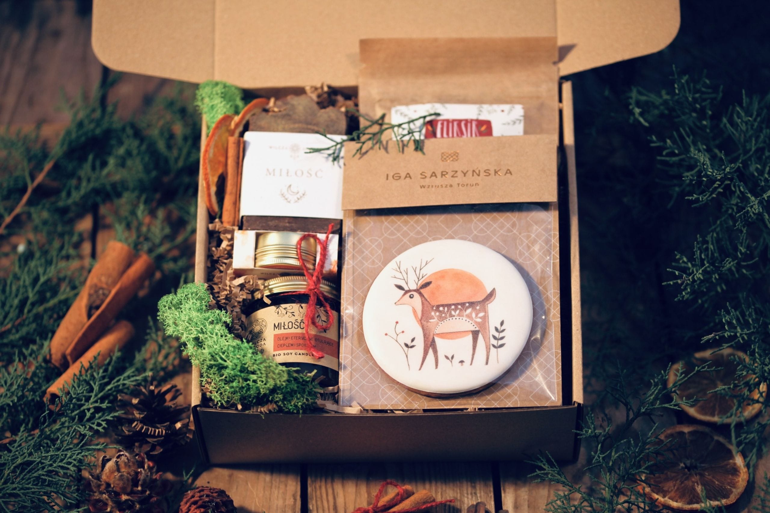 Daj znać ukochanej osobie, że jesteś, że pamiętasz podarowując prezent wypełniony po brzegi Miłością. Zestaw zawiera mydło, świecę oraz masełko do ust z serii Miłość. Pachną one pomarańczami, przyprawami korzennymi, świerkiem. Otulają ciepłem i spokojem. Troszczą się i dbają. Skorzystaj z ich dobroci przy kubku pełnym Eliksiru Niedźwiedziego zagryzając pyszną, ręcznie dekorowaną w toruńskiej pracowni pierniczkową śnieżynkę.