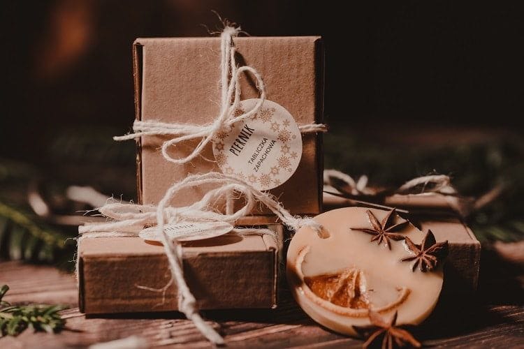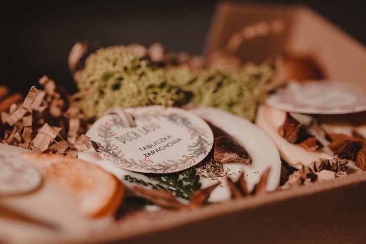 Tabliczki zapachowe ułożone na papierowym sianku, w otoczeniu suszonych ozdób i darów natury wkładamy do papierowego pudełeczka, które otaczamy banderolą z dumnie wypinającym pierś rudzikiem. Banderola wykonana jest z certyfikowanego papieru z recyklingu.