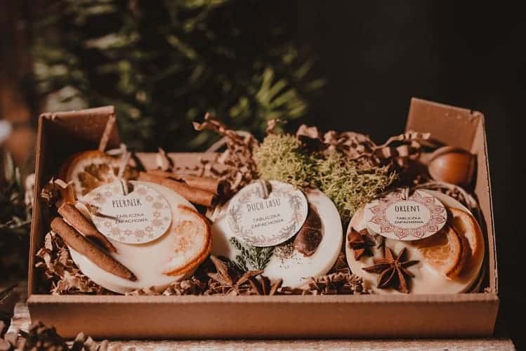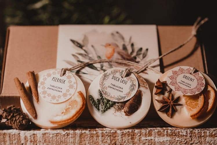 Zestaw zawiera trzy pachnące olejkami tabliczki wykonane z wosku sojowego. W podziękowaniu, z miłości, z radości, na szczęście. Zastąpi szybko więdnący bukiet kwiatów i rozniesie po domu urocze zimowe nuty zapachowe.