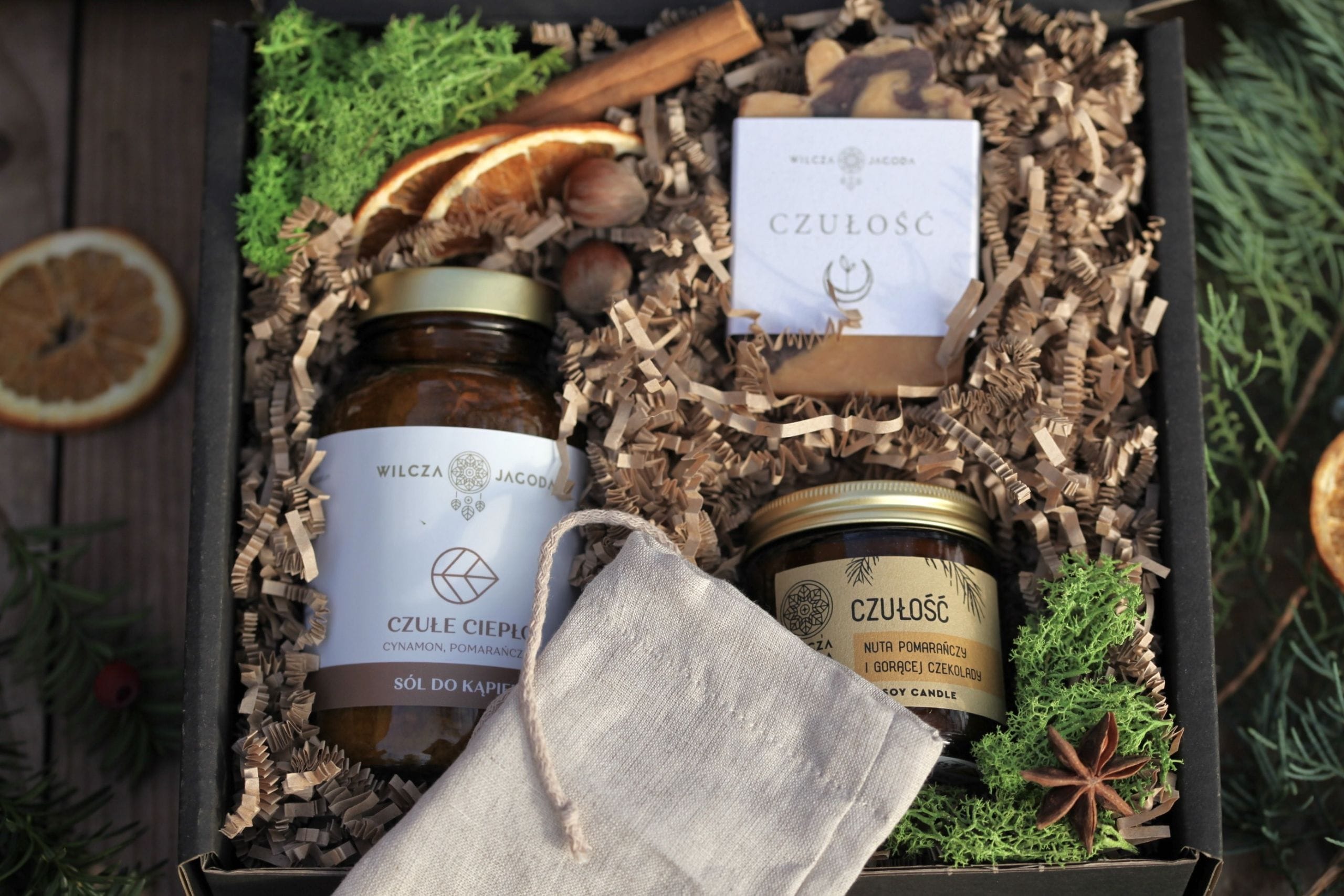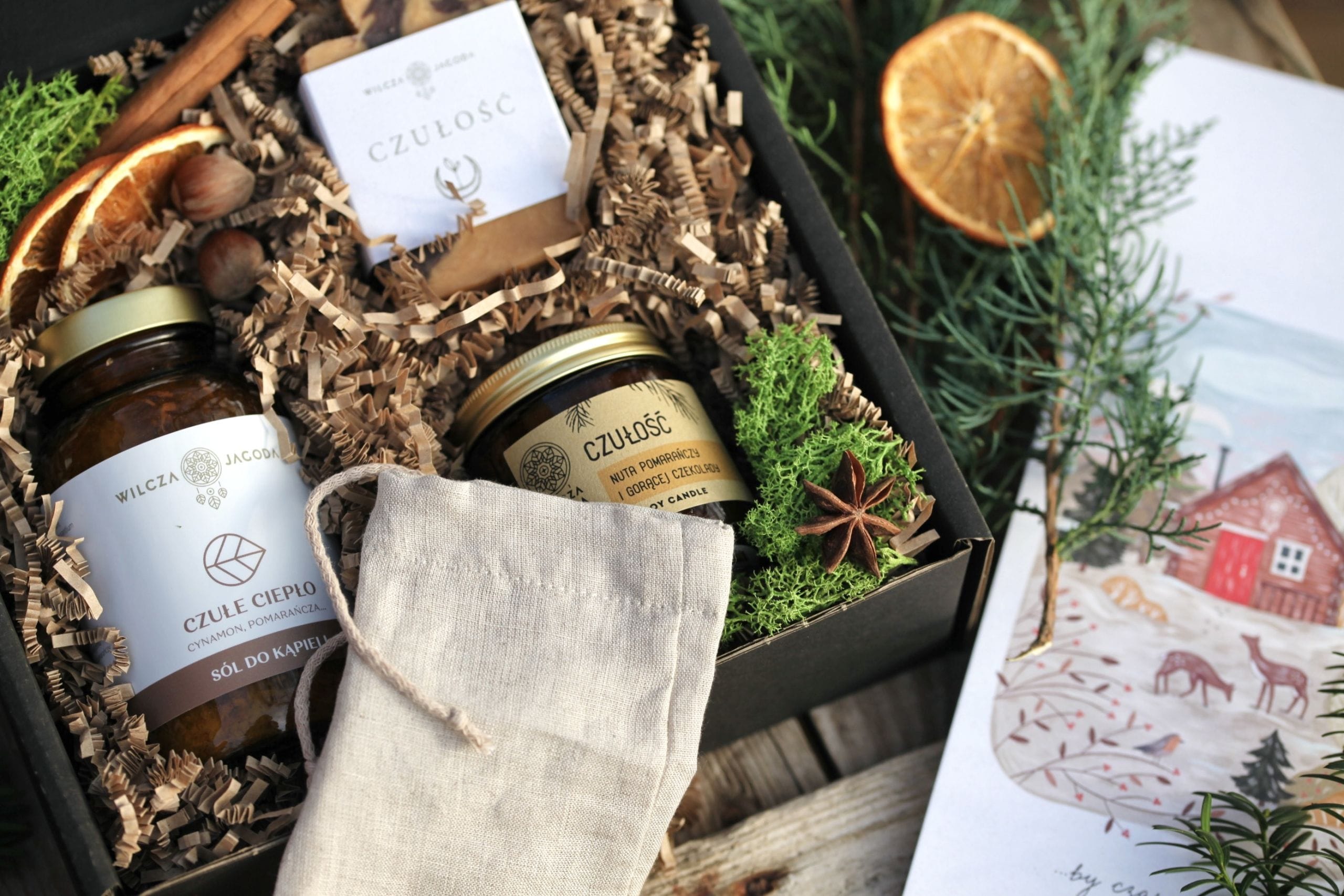 Czarny papierowy kartonik (20×20×7 cm) w ekologicznej banderoli z autorską grafiką rysowaną przez Urszulę Grzesiek specjalnie dla Wilczej Jagody. Wnętrze wypełniają papierowe wiórki oraz świąteczne akcenty – suszone plastry pomarańczy, cynamon i ozdobny mech – tworzące ciepły, aromatyczny nastrój.